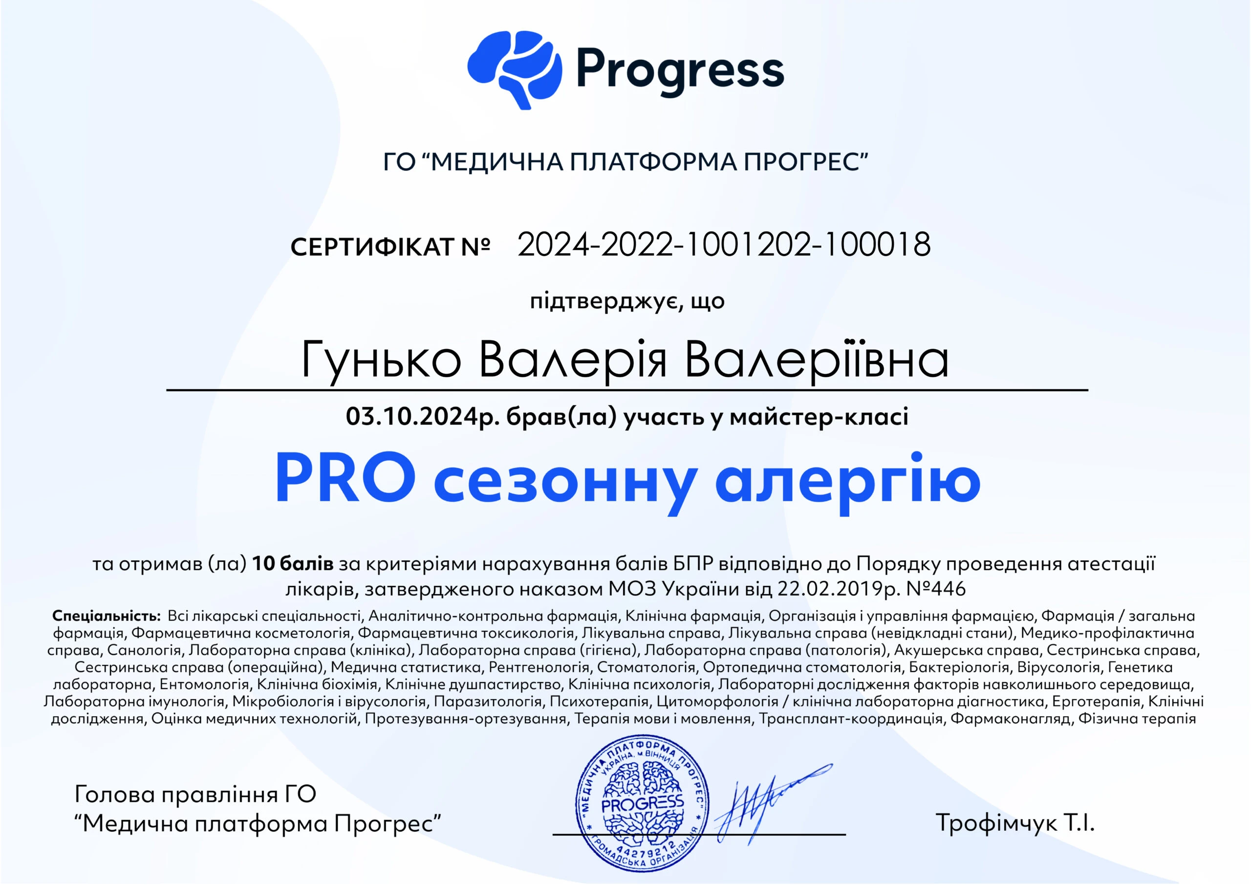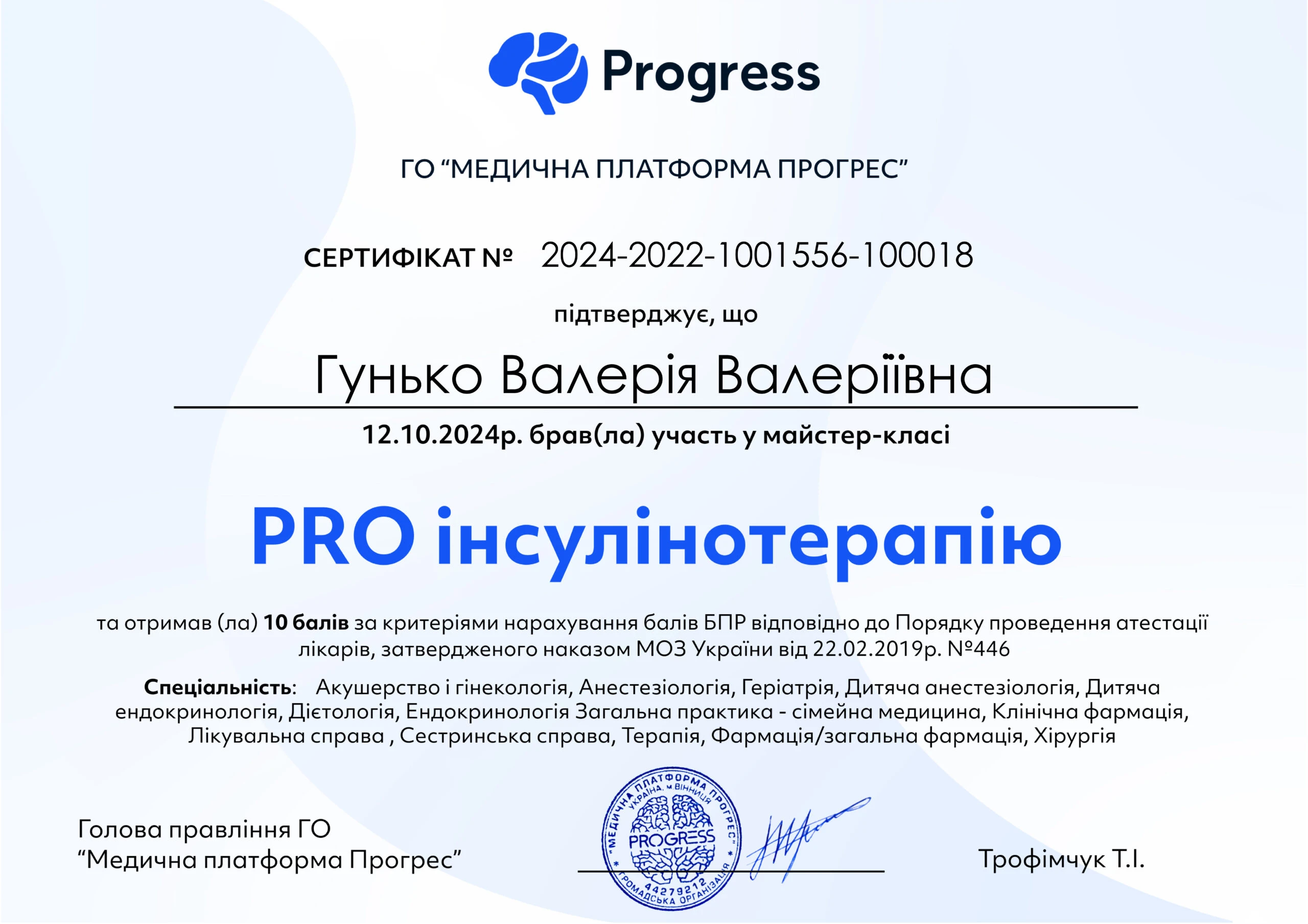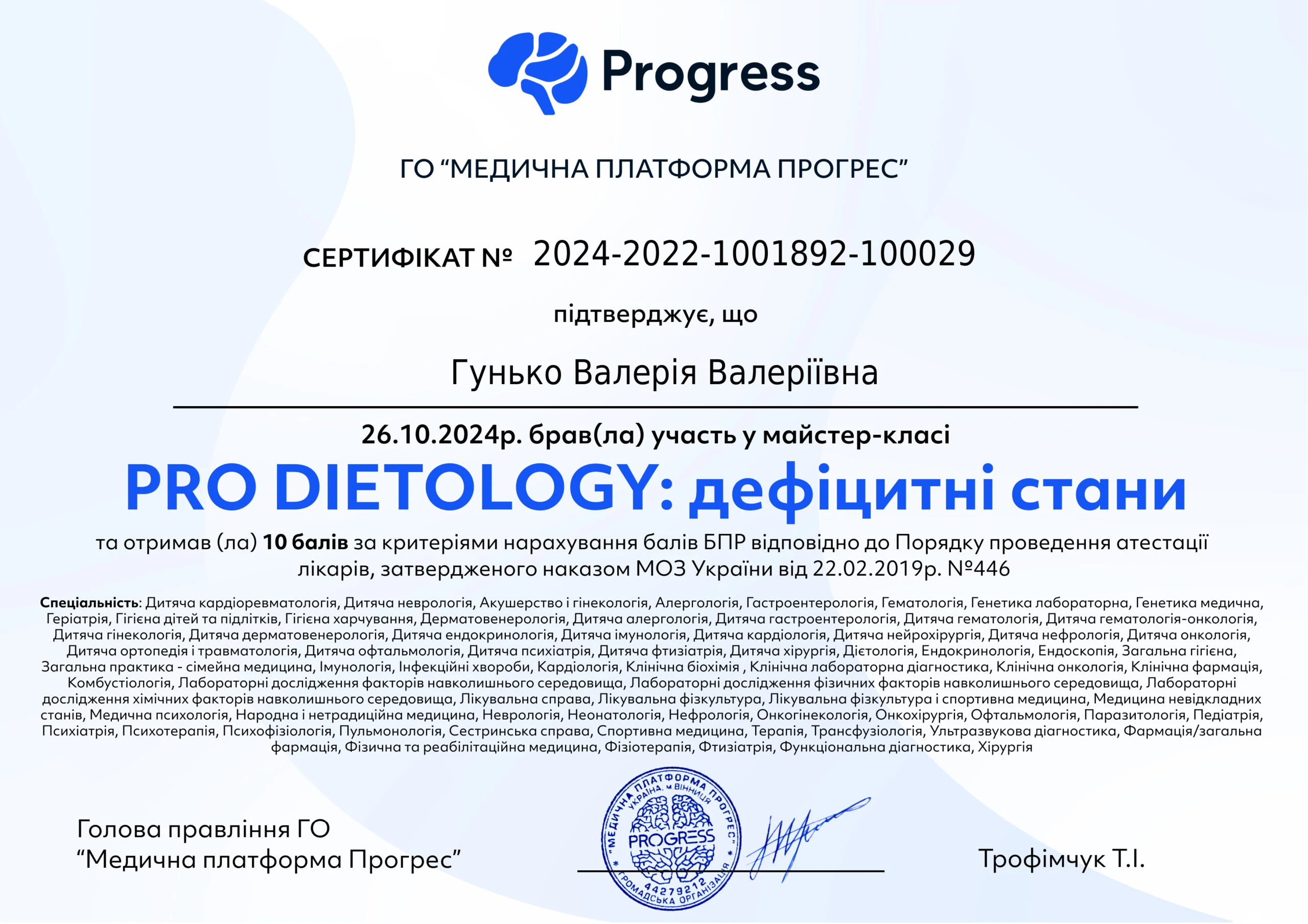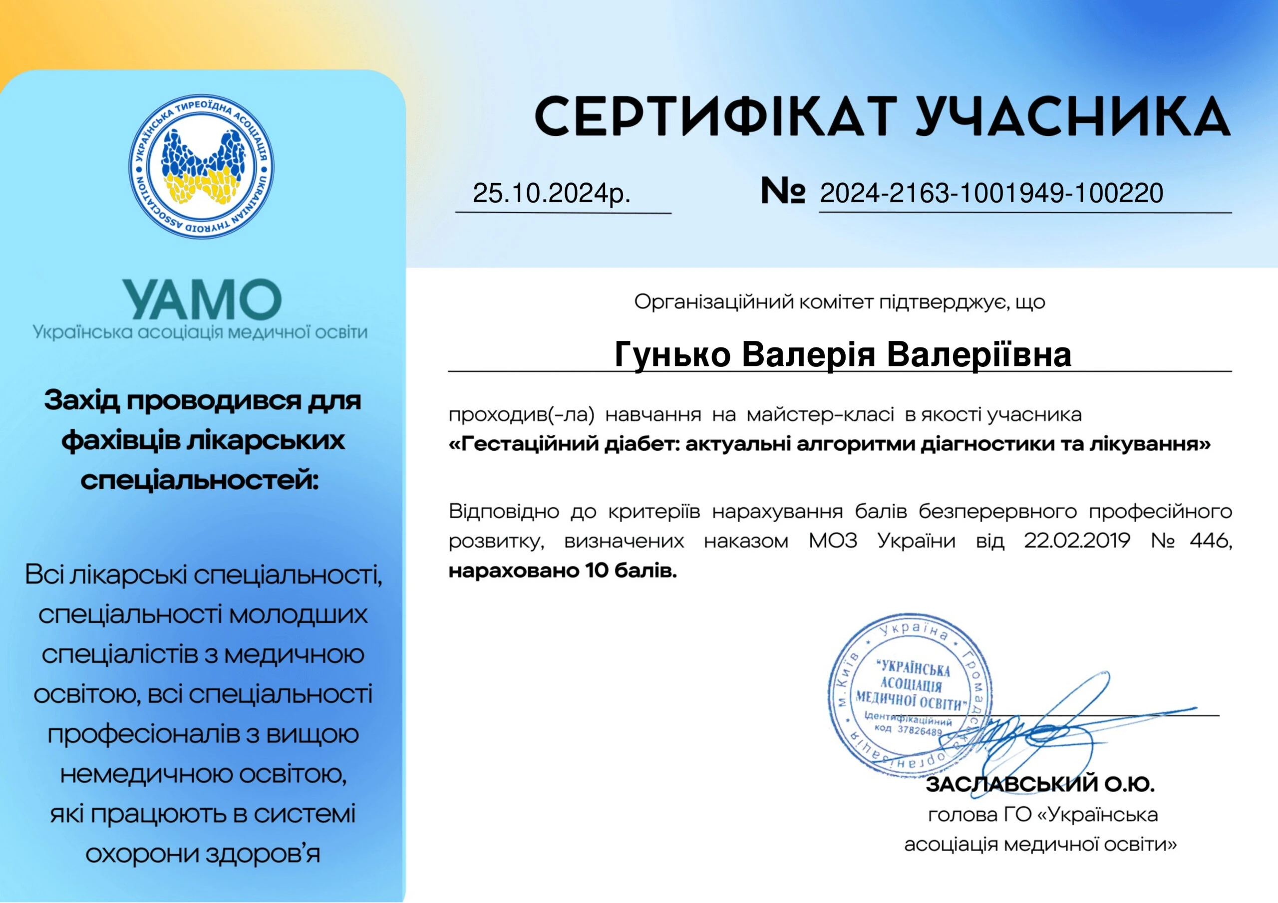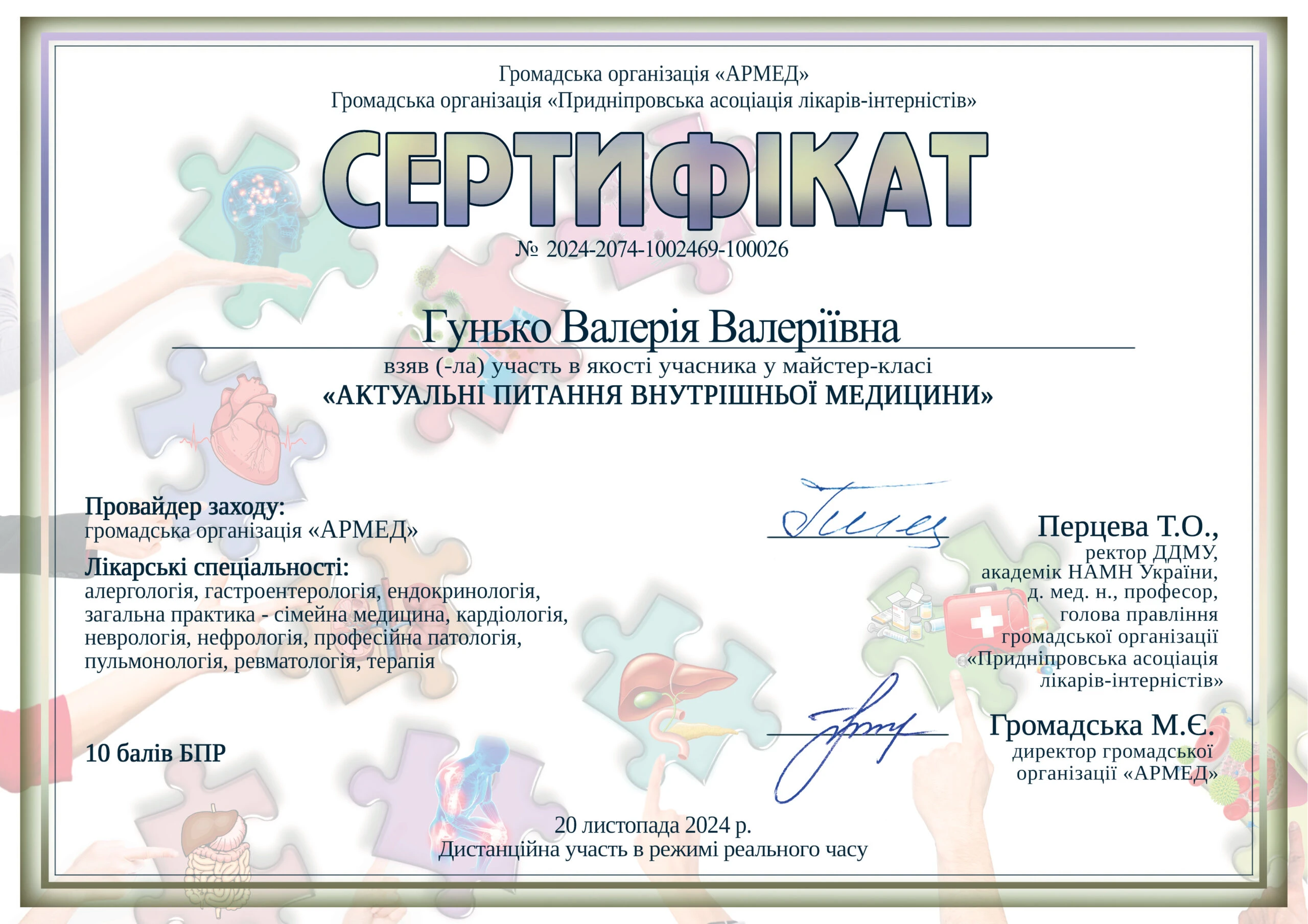 - Національна медична академія післядипломної освіти імені П.Л. Шупика, спеціальність «Внутрішні хвороби», 2024