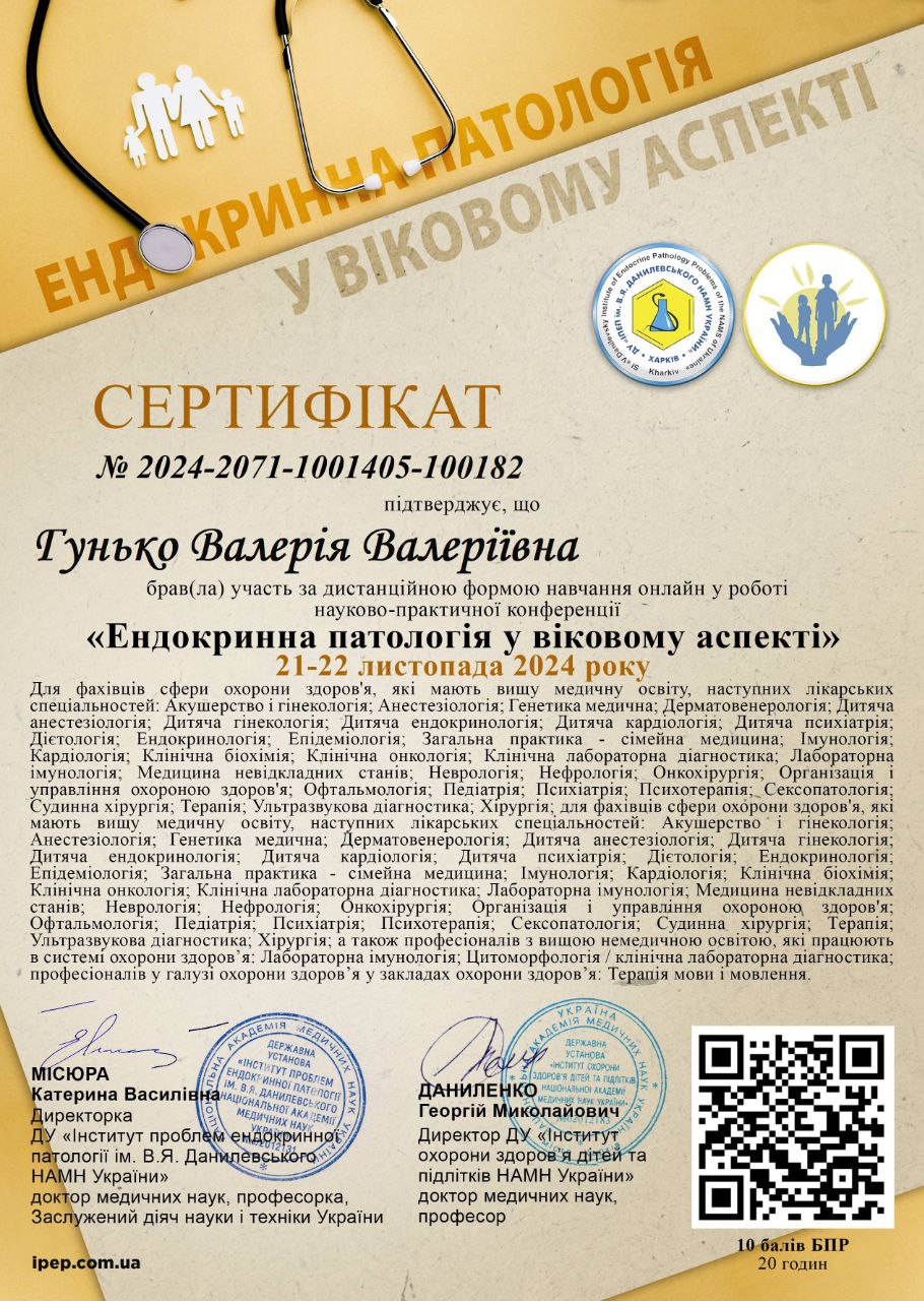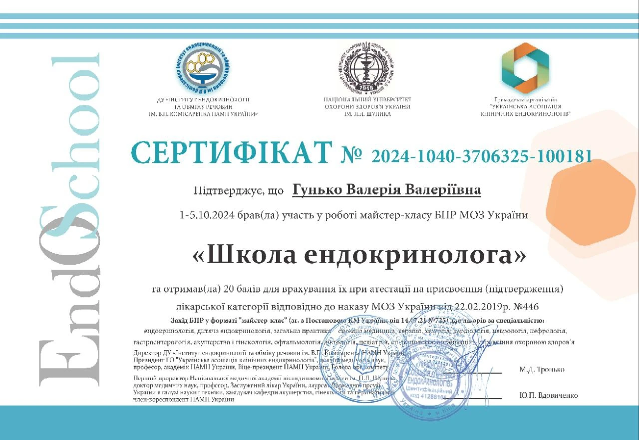 - Національна медична академія післядипломної освіти імені П.Л. Шупика, спеціальність «Ендокринологія», 2024