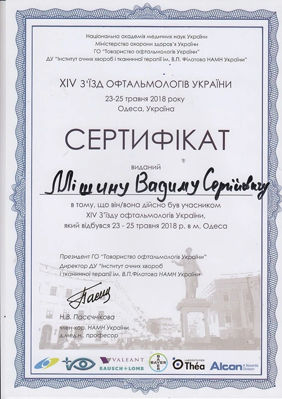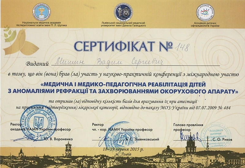 - Донецький державний медичний університет «Курс передатестаційного підвищення кваліфікації по офтальмології», 2002