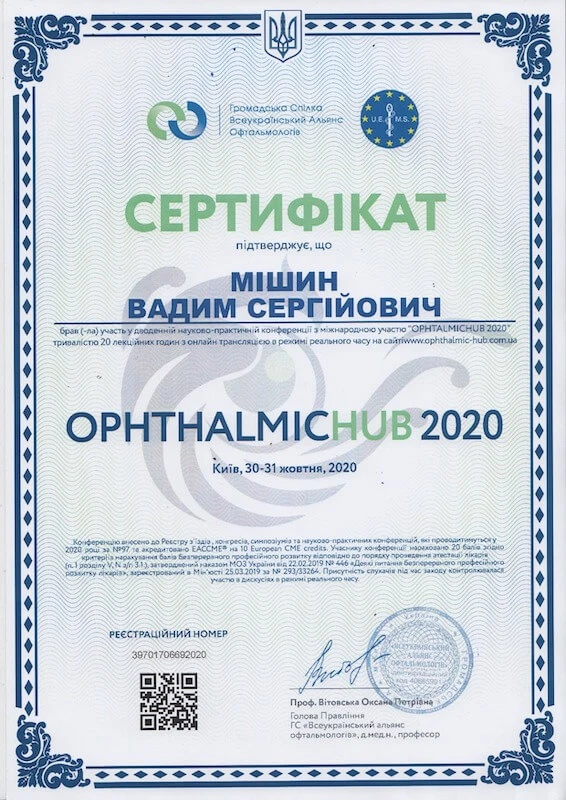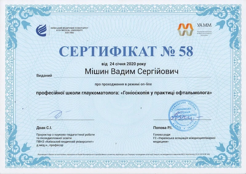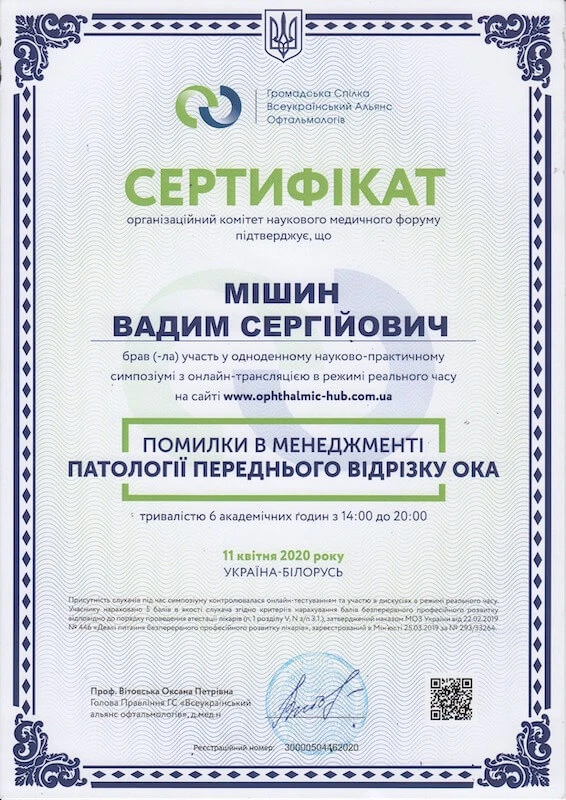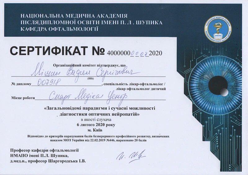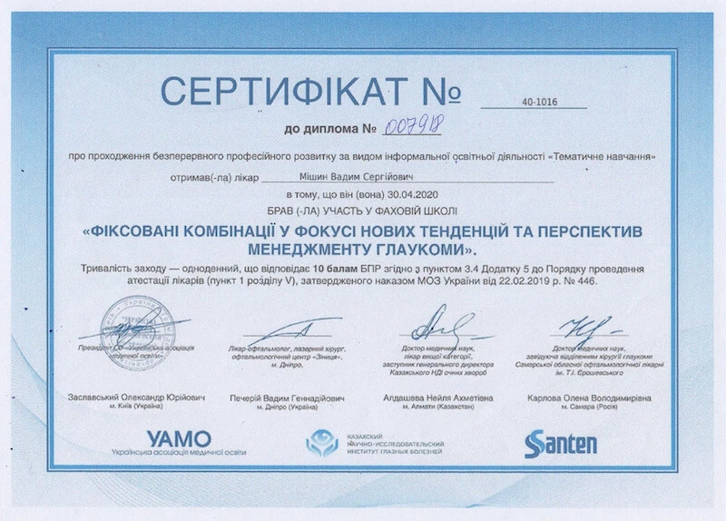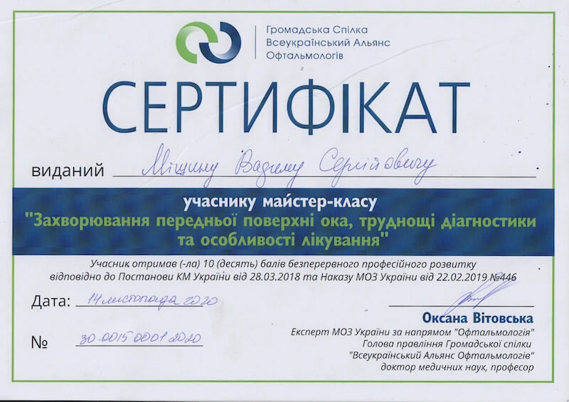 - Донецький державний медичний університет «Курс передатестаційного підвищення кваліфікації по офтальмології», 2007